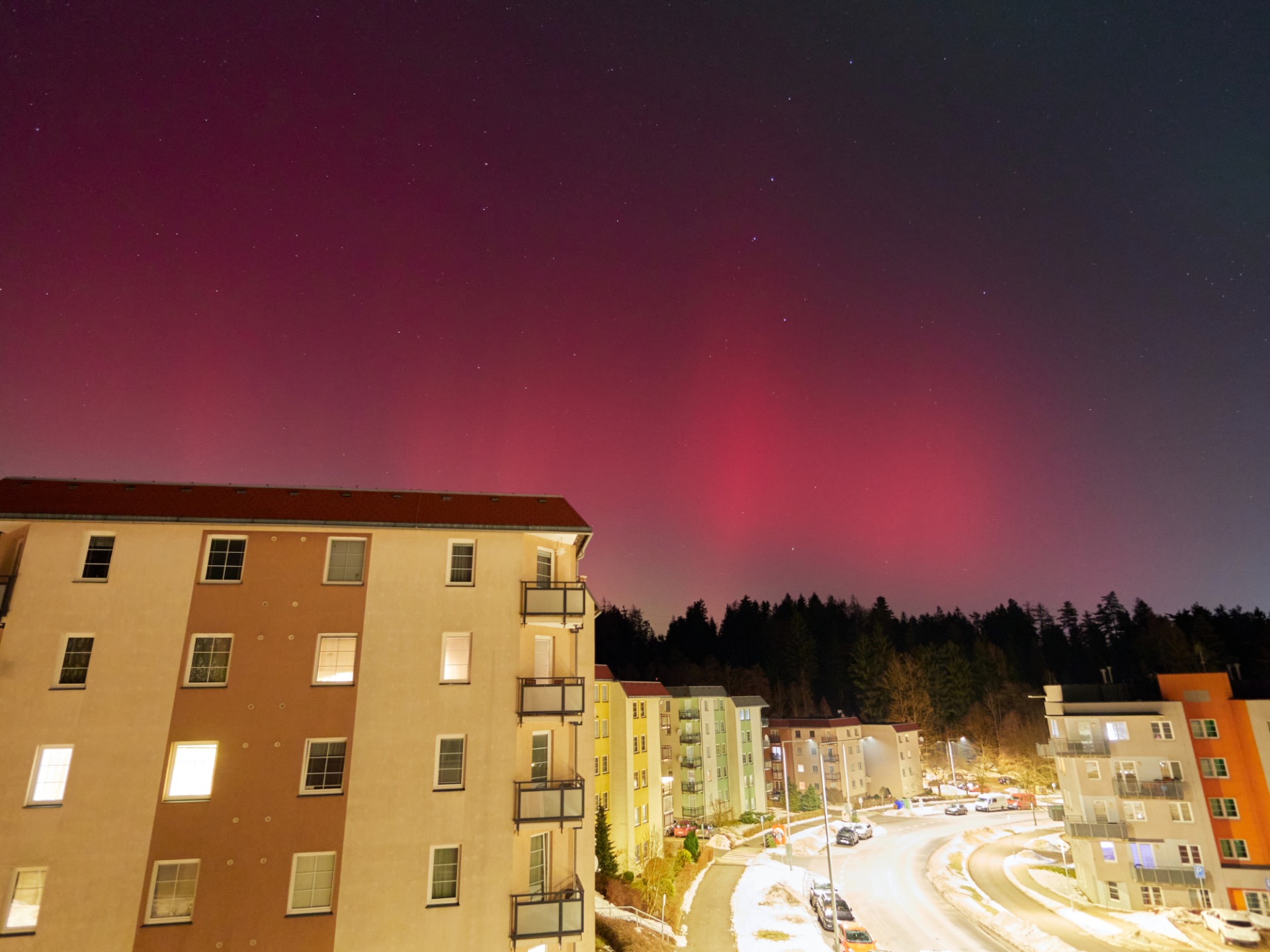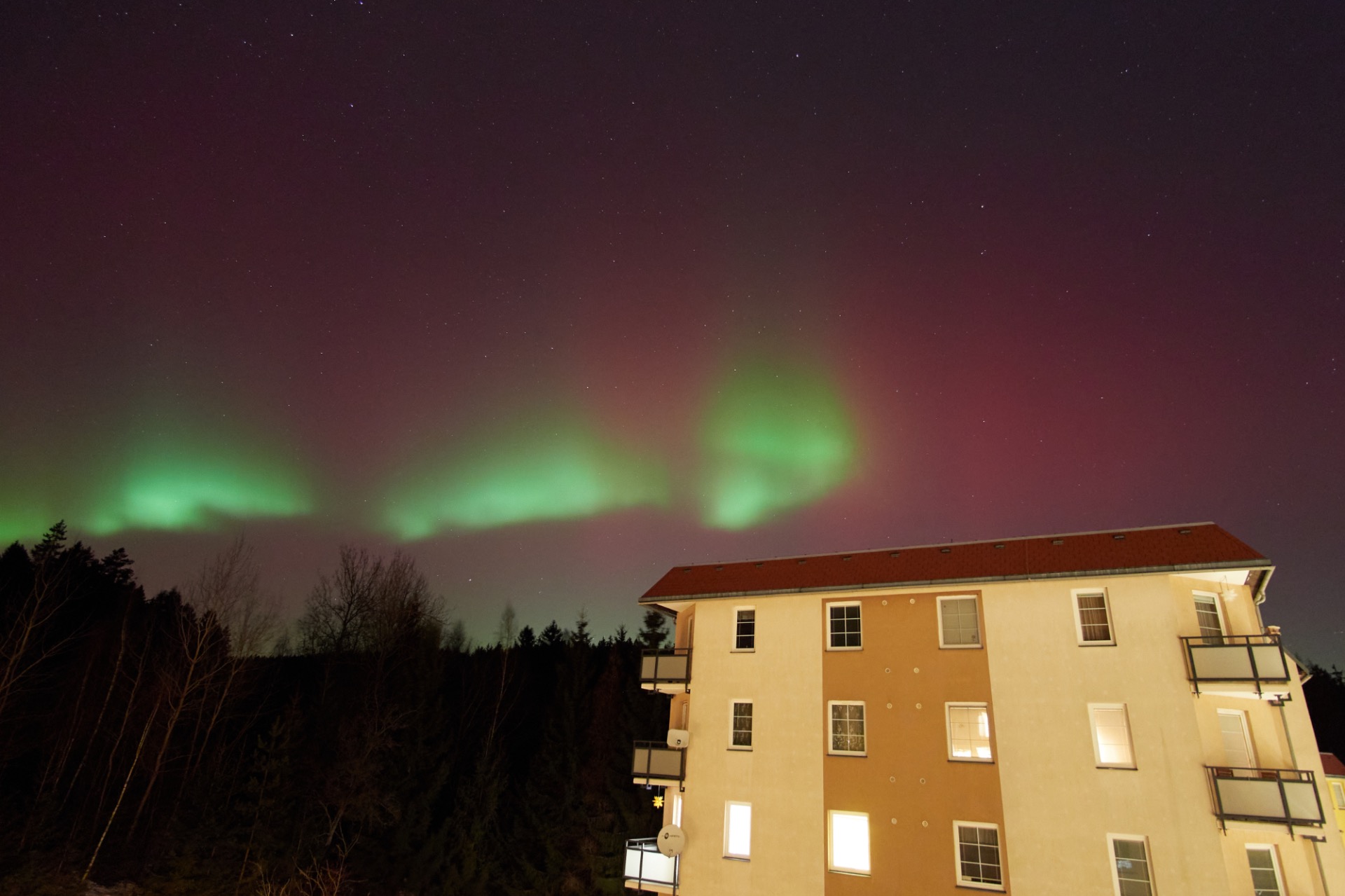 Bylo pondělí a celý víkend jsem proležel. Nebylo mi moc dobře, ale nedalo mi to. Vytáhl jsem ze skříně malý stativ, na foťák nasadil nejširší objektiv, co mám (Panasonic 9mm/f1,7) a vyšel na balkón. Bylo to neskutečné. Nikdy bych nevěřil, že budu pozorovat takhle silnou polární záři, viditelnou barevně i očima z okna a balkónu našeho bytu. Byla vidět jasná červená a zelená barva a neuvěřitelně dynamicky se to měnilo. Udělal jsem pár fotek z ruky a kochal se. Byl ale hodně silný vítr, a tak jsem pak nastavil časosběr a šel dovnitř.