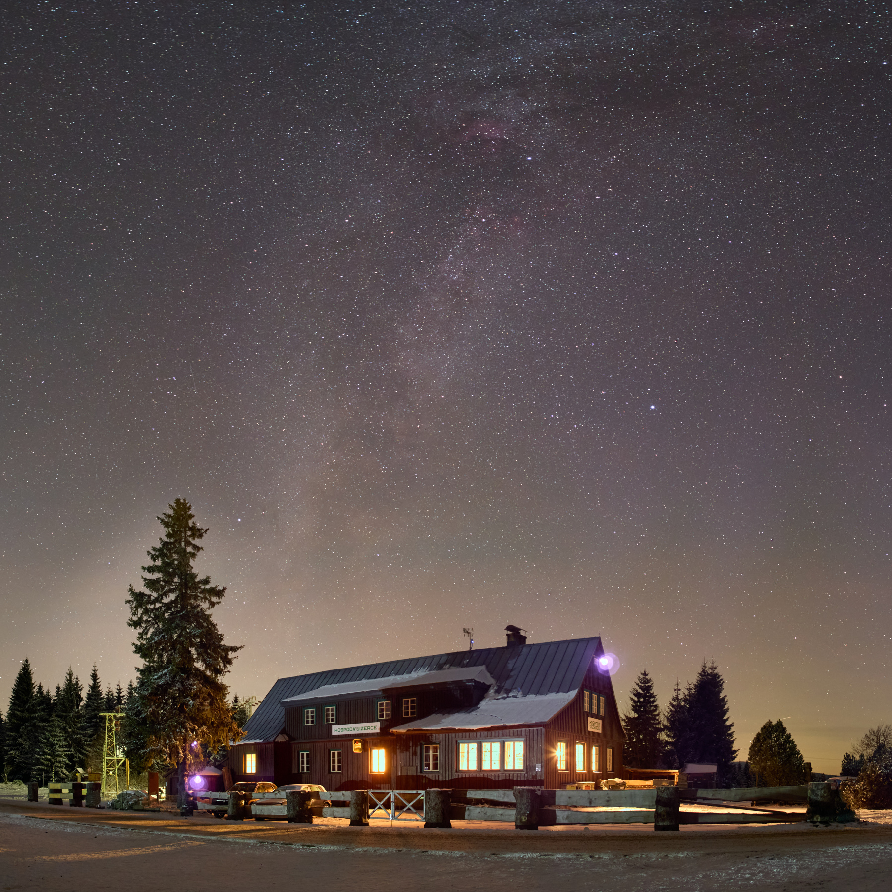 Pak už přišlo na řadu noční focení na Jizerce. Pořídil jsem si Canon 6D a nechal si ho zmodifikovat na astrofotografii. Je tak více citlivý na červenou barvu a na fotkách pak jsou výrazněji vidět emisní mlhoviny. Trochu je to vidět i na této panoramatické fotce hospody Jizerka s kouskem mléčné dráhy.