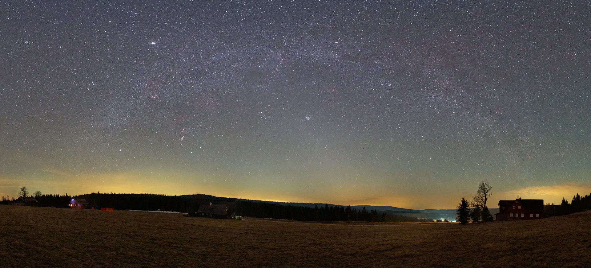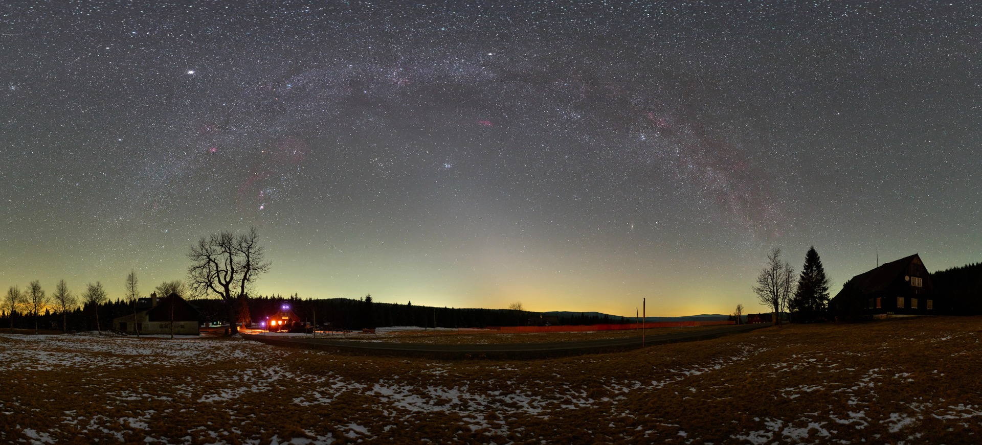 V půlce března jsem se vypravil na Jizerku zkusit vyfotit zvířetníkové (zodiakální) světlo, což je sloup slunečního světla rozptýleného na částicích meziplanetární hmoty, které pocházejí především z ohonů komet, drolících se asteroidů atd. Světelný kužel se na oblohu promítá do zvířetníkových neboli zodiakálních souhvězdí, odtud tedy ten název. Bohužel ani na Jizerce už to není ideální z hlediska světelného znečištění, takže na fotce to vidět je, ale bohužel hodně slabě (zhruba uprostřed snímků směrem od hvězdokupy Plejády šikmo dolů). Panoramata s mléčnou dráhou jsou složena cca ze 40 fotek ve třech řadách a použil jsem na to tři různé programy, než se mi to podařilo složit do jedné fotky, aby to nějak vypadalo (nakonec vyhrál program PTGui). A pak jsem ještě docela dlouho retušoval ty Muskovy starlinky, které už jsou úplně všude a nejde snad už udělat fotka bez nich.