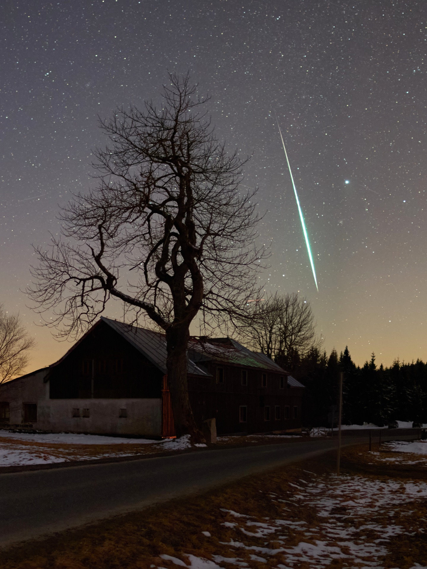 A jak to tak bývá, když jedu fotit cíleně nějaký úkaz, vyfotím i nějaký další úplnou náhodou (mám na to nějaké štěstí). A tentokrát to byl opravdu zážitek, hlavně vizuální, kdy jsem viděl výrazný jasný bolid (meteor), navíc přesně v místě, kam jsem měl zrovna namířený foťák, takže ho mám i vyfocený. Byl opravdu jasný, sytě zelený, fotka je jen slabý odvar toho, co jsem viděl na vlastní oči. Nahlásil jsem ho pak na Astronomický ústav AV ČR, který pak k tomu vydal i článek: